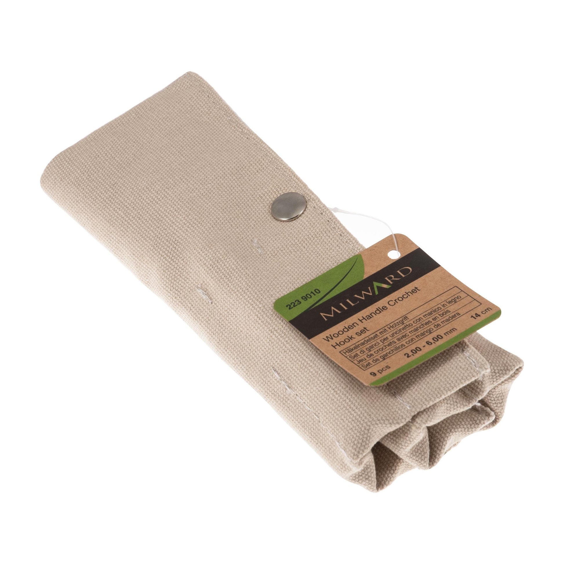 Wrap of aluminium crochet hooks with beech wood handles. Length: 14.00cm. Diameters: 2.00, 2.50, 3.00, 3.50, 4.00, 4.50, 5.00, 5.50 & 6.00mm. Ideal gift, treat or starter set.